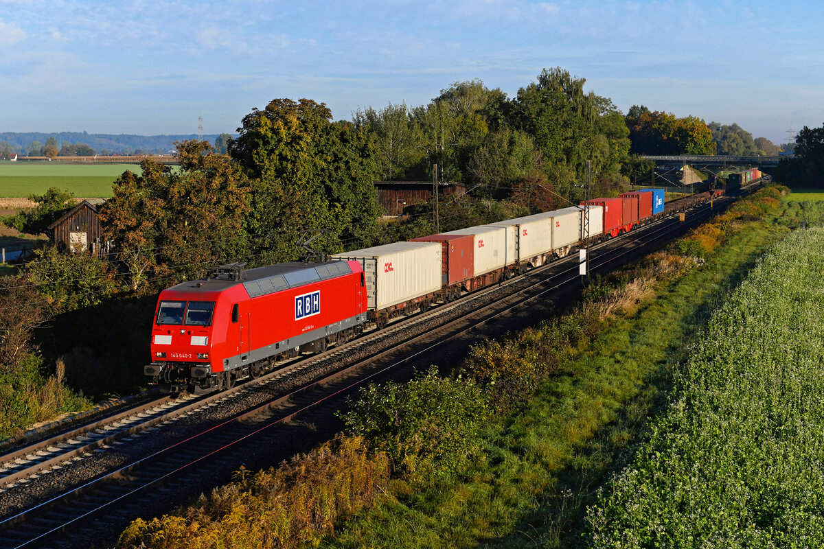 Seit geraumer Zeit an die RBH vermietet ist die 145 040 von DB Cargo. Am 15. Oktober 2021 konnte ich sie vor einem Containerzug nach München Riem beobachten. Die Aufnahme entstand bei Langweid vor den Toren Augsburgs.