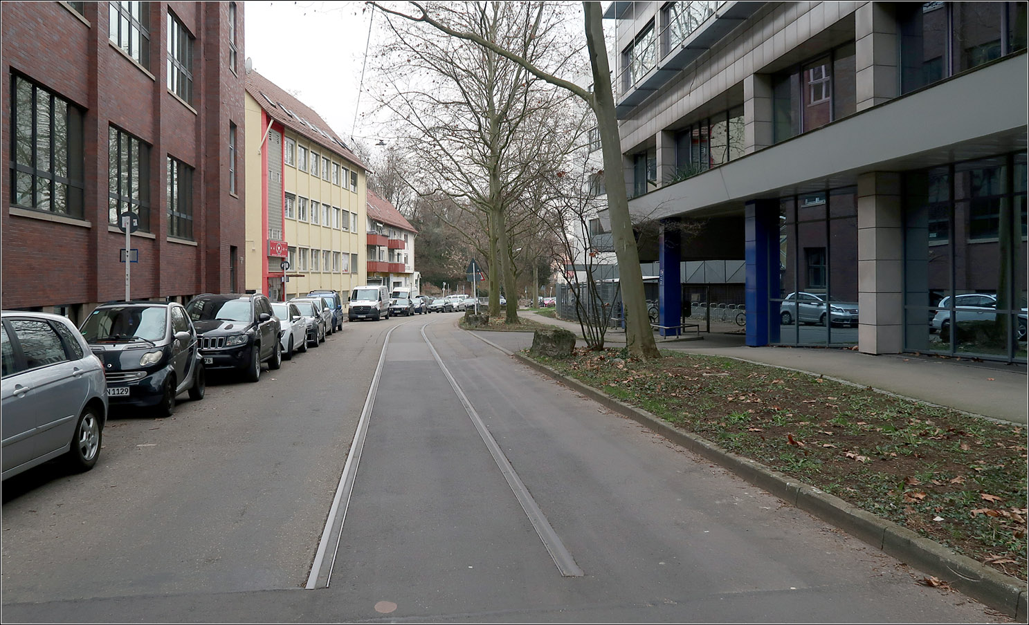 Ein kleiner Gleisrest findet sich noch im Kreuzungsbereich der Glockenstraße mit der Quellenstraße. Auch hier hat man ein deutliches Gefälle.