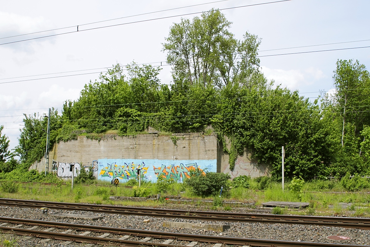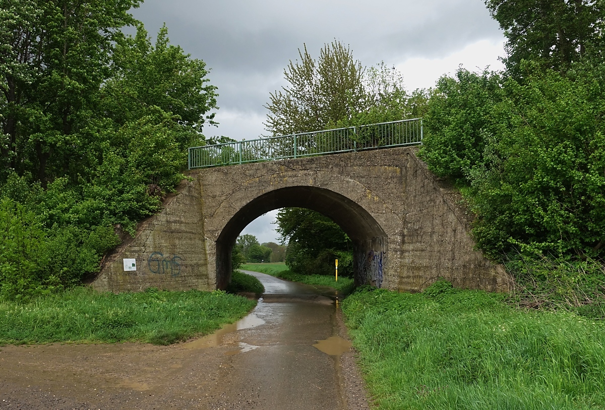 An das Anfang des 20. Jahrhundert geplante Projekt einer Bahnverbindung von Neuss- Holzheim über Rommerskirchen/Liblar/Rheinbach nach Dernau (mit Anschluss an die Eifelbahn) bzw. Sinzig an der Rheinstrecke erinnert heute noch der ca. 13 km lange "Strategische Bahndamm" zwischen Holzheim und Rommerskirchen. Ein Zug ist hier allerdings nie gefahren. Nach dem Ende des 1. Weltkrieges waren zwar rund 80 % des Bauprojektes abgeschlossen, doch verhinderten zunächst die belgischen und französischen Besatzungsmächte, später Geldmangel die Fertigstellung. Seitdem dient der Bahndamm nur noch der Naherholung. Zum Bild: Blick auf den Bahndamm bei Rommerskirchen, im Hintergrund der Bahnhof Rommerskirchen an der Strecke Köln - Mönchengladbach (15.05.2021).