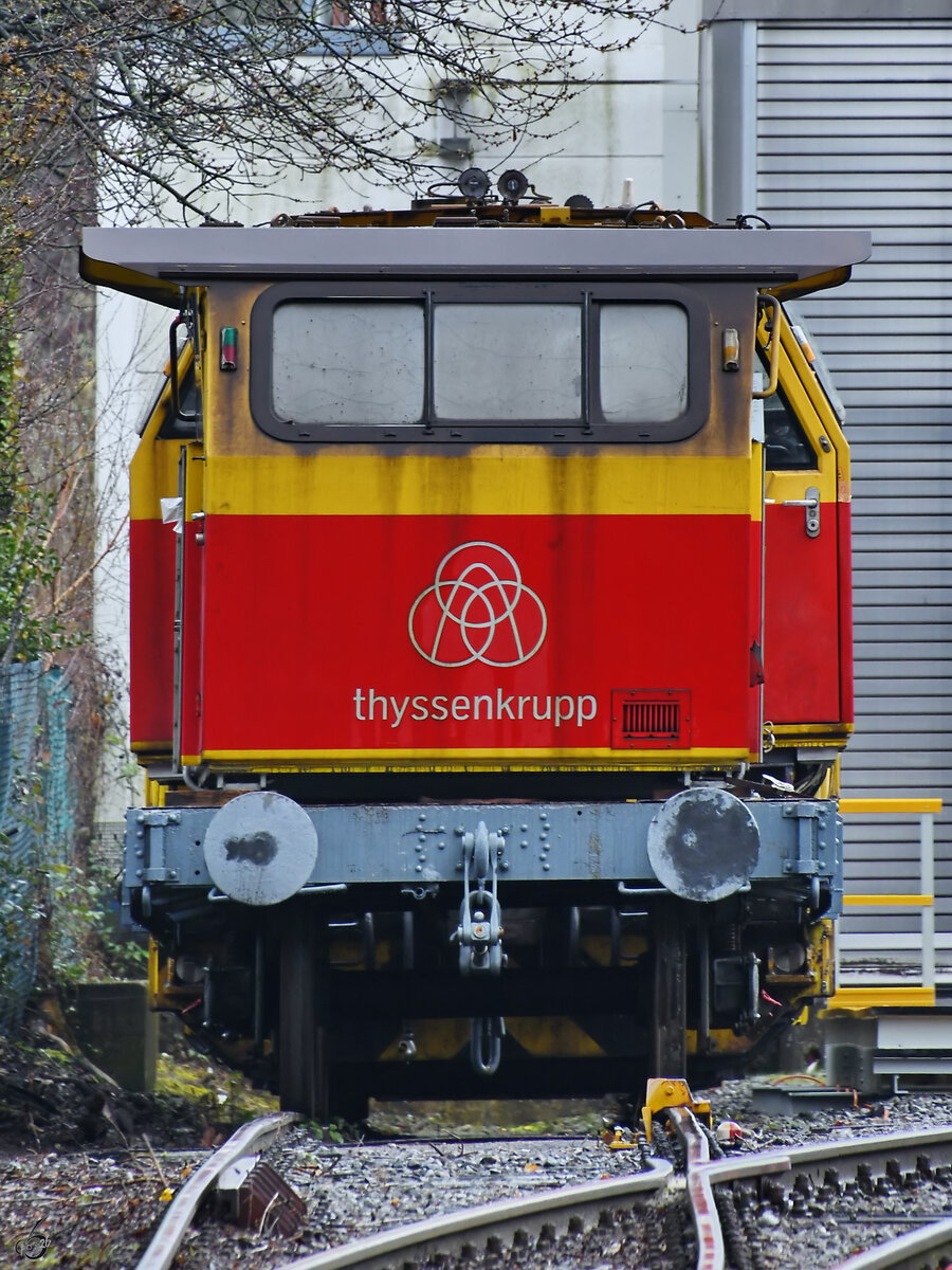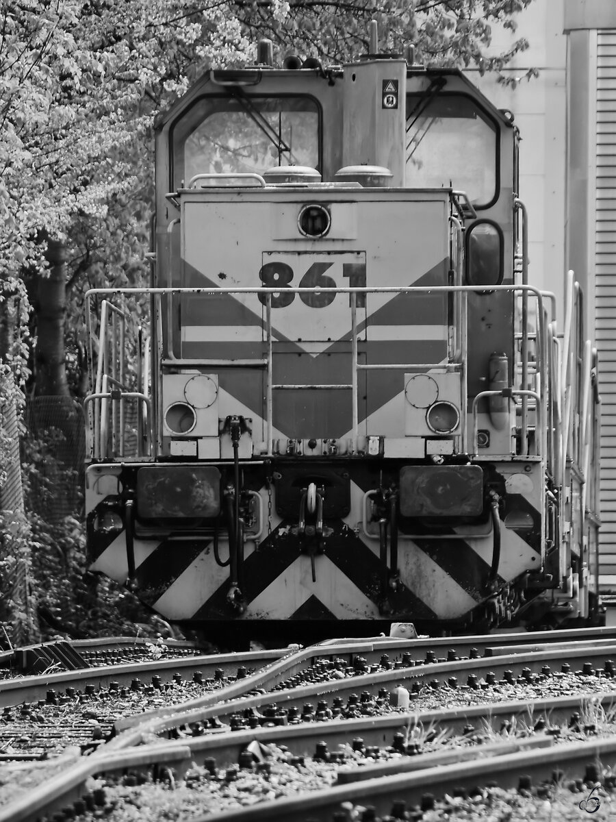 Die TKSE-Werkslokomotive 861 (Fabriknummer 20339) wurde 1998 bei Krauss-Maffei gebaut und ist hier Mitte April 2026 in Hattingen abgestellt. (Fotostandort: öffentlicher Fußweg) Christian Bremer