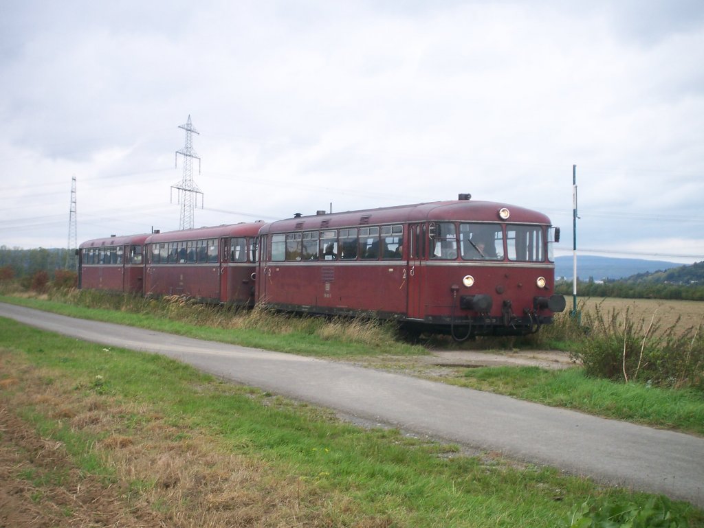 VT98 bei einer Sonderfahrt auf der Vorwohle-Emmerthaler Eisenbahn, am 03. Oktober 2009 zwischen Emmerthal und Grohnde. Durch den dichten Bewuchs der Strecke wurde die Weiterfahrt zum Bahnhof Grohnde an diesem Punkt der Strecke abgebrochen um den Lack und die Fensterscheiben des Triebwagens nicht unnötig zu beschädigen. Benno V.