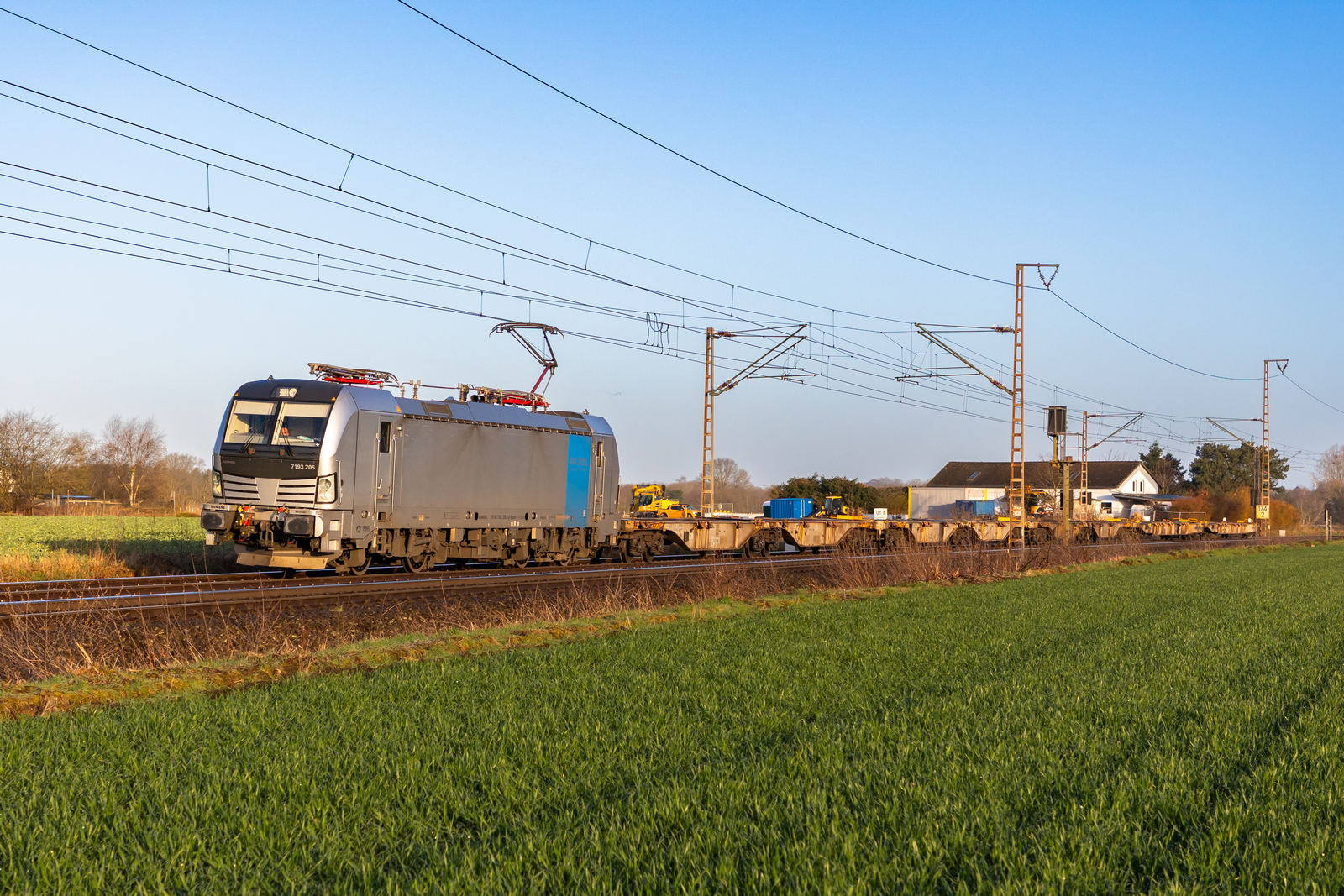 7193 205 mit einem sehr kurzen leeren Containerzug südlich von Loxstedt am Morgen des 29.3.26 nach Bremen.