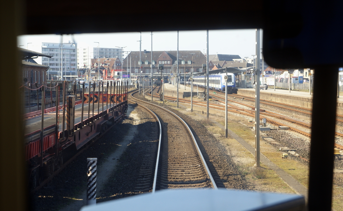Die Nösse im Osten Sylts wird vorwiegend landwirtschaftlich genutzt, im Hintergrund ein von einer 245 gezogener Autozug nach Westerland (04.06.2022)