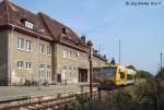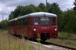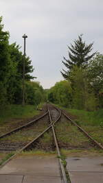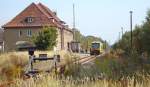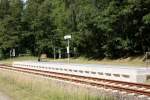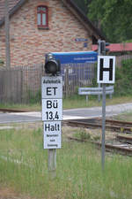 Links verlief früher die Hauptstrecke nach Wittstock und rechts die Nebenbahn nach Rechlin. Auf Wikipedia gibt es einen ausführlichen Artikel zur „Bahnstrecke Wittenberge–Strasburg“. Mit einem Bild, das nur ein Jahr vorher an der gleichen Stelle aufgenommen wurde und noch Gleise auf beiden Strecken zeigt!
