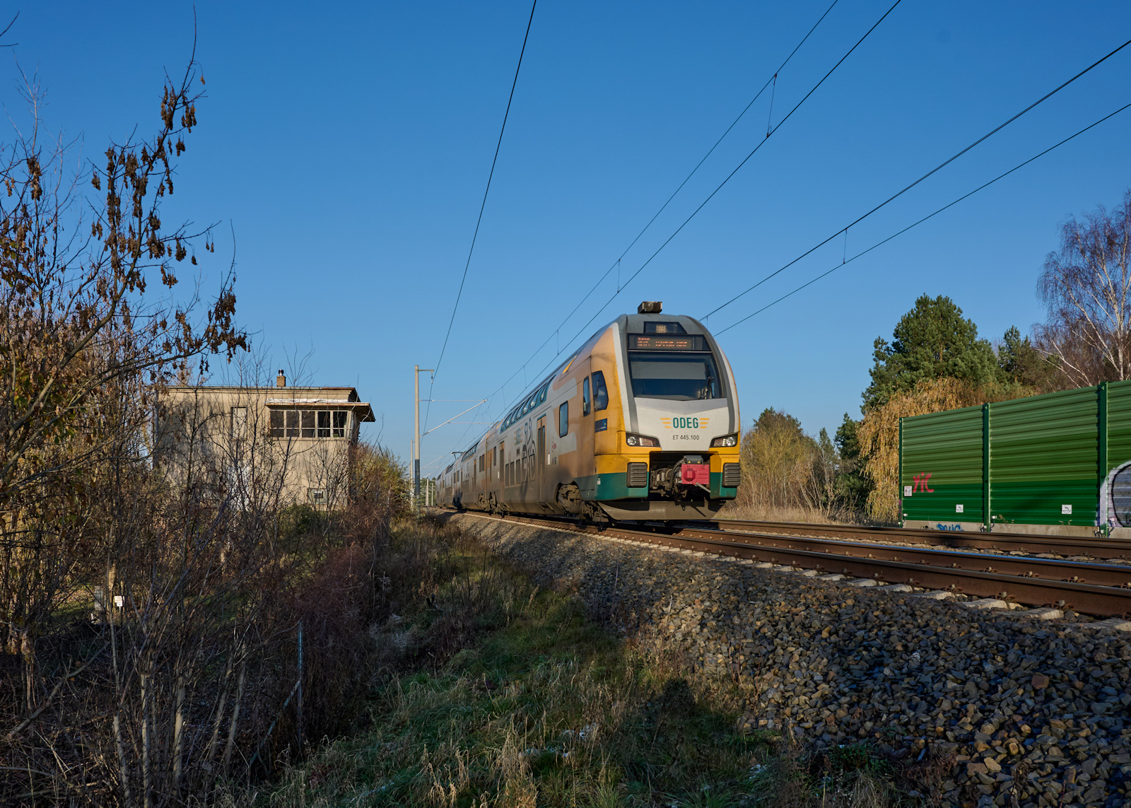 Die Züge des Brandenburger RE 6 wurden zwischen August 2025 und April 2026 zeitweise über Oranienburg umgeleitet. Am 22.11.2025 war 648 111 in Richtung Berlin unterwegs. Am ehemaligen Abzweig Fichtengrund spiegelt sich das alte Stellwerk in den Fahrzeugfenstern.