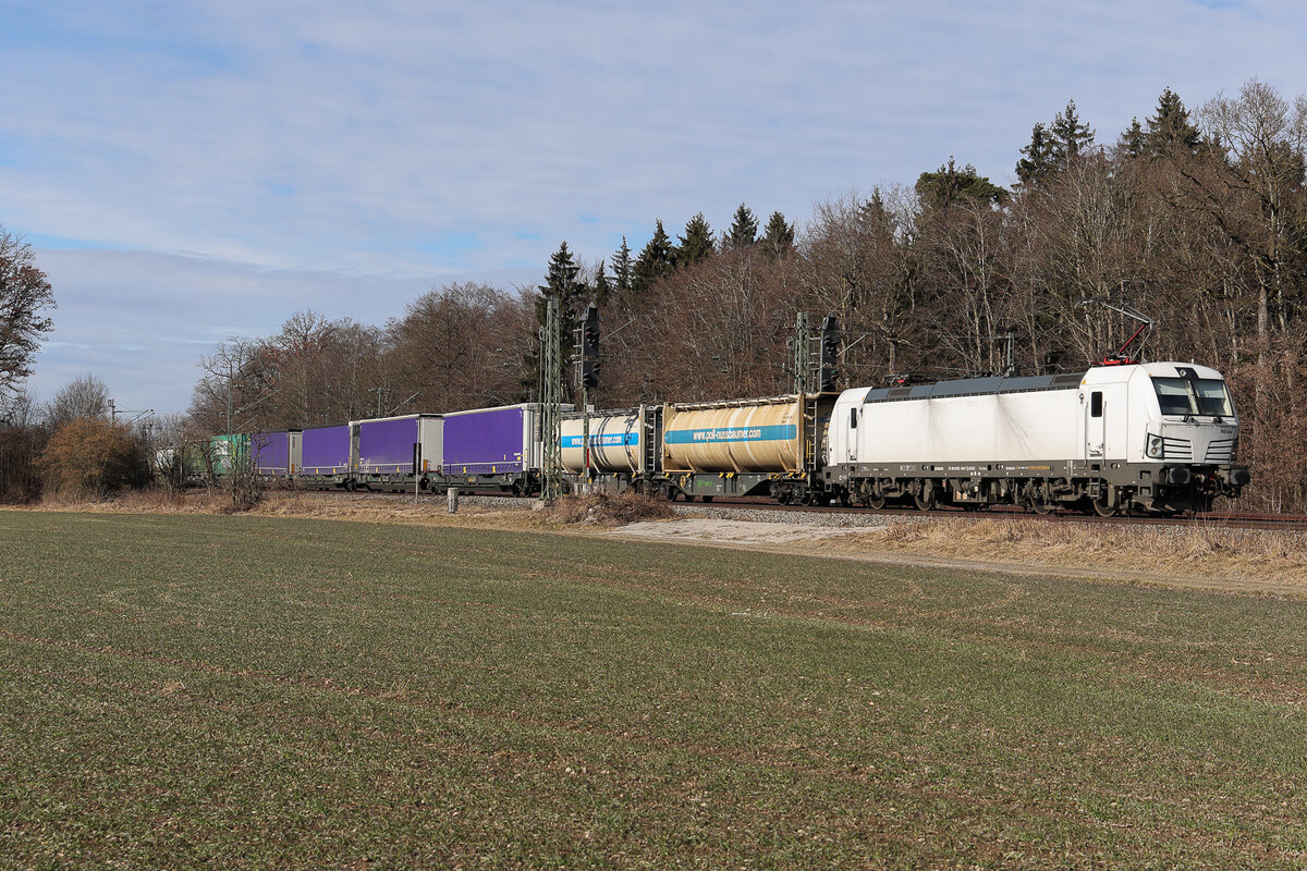Während auf dem gegenüberliegenden Bahnsteig Fahrgäste auf die S-Bahn nach Dresden warten, kommt in Gegenrichtung SIEMENS VECTRON 193 784 CAPTRAIN mit einem Zug Kesselwagen durch; Kurort Rathen (Sächsische Schweiz), 29.04.2018