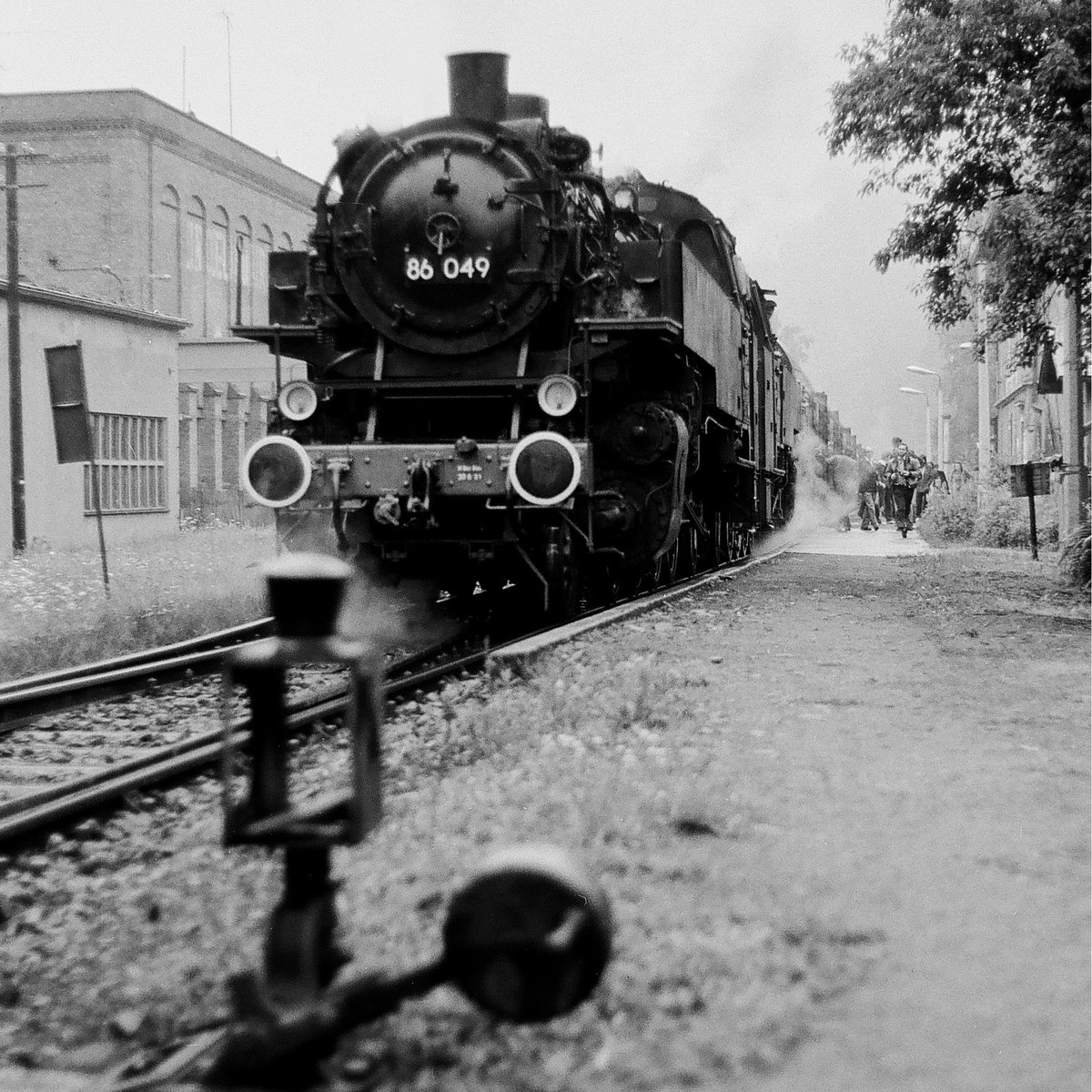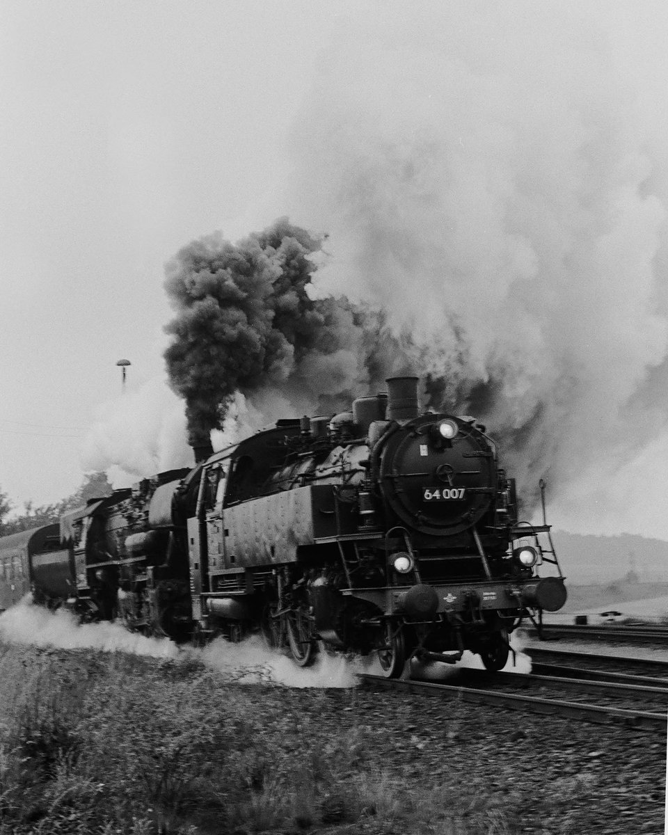 16. Juni 1984, Die Lokführer von 64 007 (1928 Borsig) und 52 8122 fahren mit einem Sonderzug aus Hoyerswerda in Dürröhrsdorf ein und begeisterten die Fotografen dank angezogener Bremsen mit mächtigen Rauch- und Dampfwolken. Die hier führende 64 007 war 1971 z-gestellt worden. 1983 erfolgte die betriebsfähige Aufarbeitung im RAW Meiningen. Im Sommer 1983 wurde die Lok im Bw Güstrow stationiert und kam von dort aus zu vielen Sonderzugeinsätzen. 1998 gelangte sie nach Schwerin und wird seither vom Verein „Mecklenburgische Eisenbahnfreunde Schwerin e.V.“ betreut (Quelle: eisenbahn-museumsfahrzeuge.com). Jürgen Krause