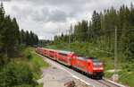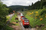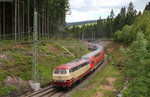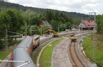 Hennigsdorf b. Berlin: Lok 218 469-5 der RP Railsystems stellt am 5.8.25 einen Überführungszug mit einem X80 für die SJ/ Västtrafik zusammen.Aus Profilgründen werden diese 3-Wagen-Züge nach wie vor auf  Loco-Buggies von Rail-Adventure befördert. Ziel ist Rostock See-Hafen, wo sie dann auf eigene Räder gestellt werden und den Weg nach Schweden mit der dortigen  Eisenbahn-Fähre fortsetzen. Bemerkenswert die vielen Güterwagen im Zug, die neben den beiden Kuppelwgen teils dem Mitführen bzw. Rücktransport der Loco-Buggies und der Hebeböcke für das Auf- bzw. Absetzen des X80 von den Buggies dienen und zusätzlichen Wagen zum Erreichen der nötigen Bremshundertstel.