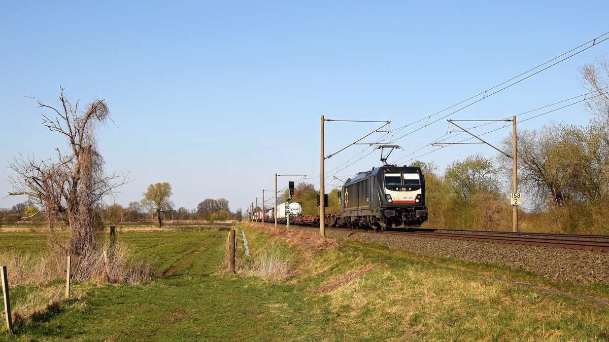 BRCE (ex DB Cargo) 187 106 (91 80 6187 106-0 D-DISPO), vermietet an Kombirail Europe, mit KLV-Zug in Richtung Osnabrück (Hüde, 02.04.2025).