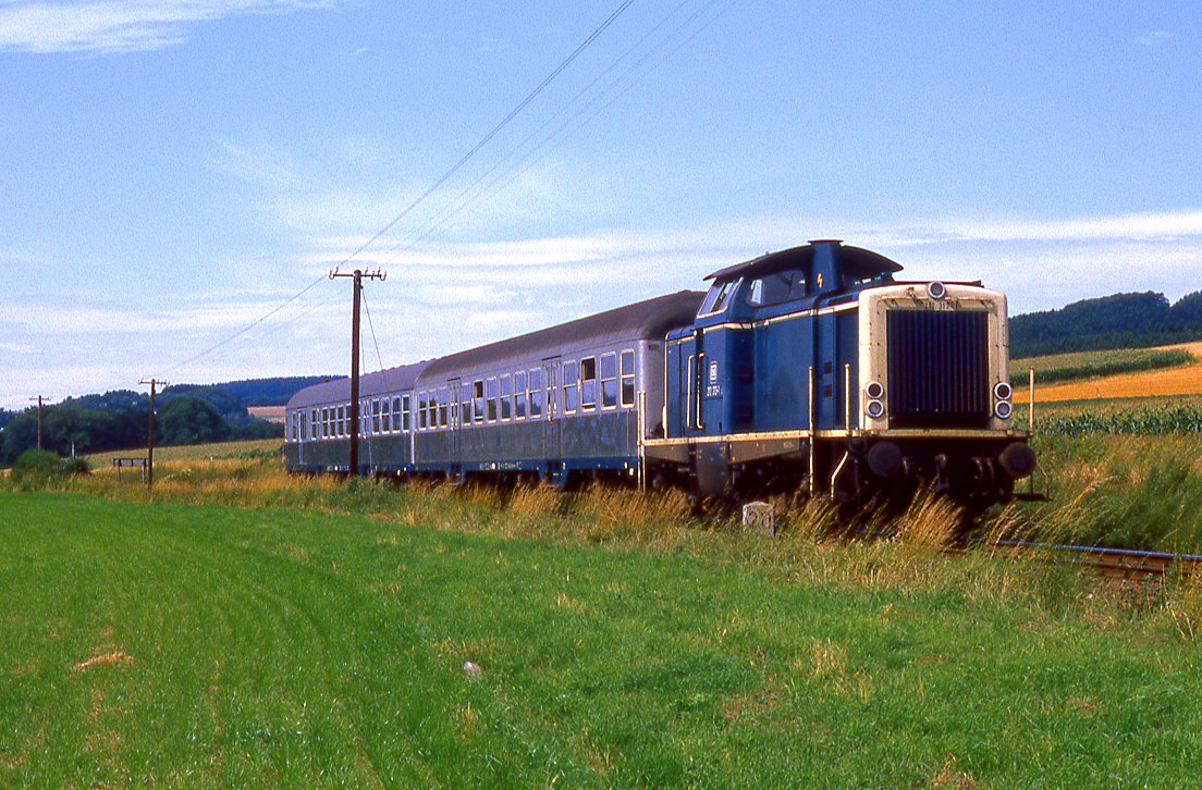 Eine Sechsteilige Schienenbus-Garnitur auf einer Sonderfahrt der AKE ins Hönnetal verlässt auf dem Rückweg nach Köln Bösperde in Richtung Fröndenberg (21.05.2023)