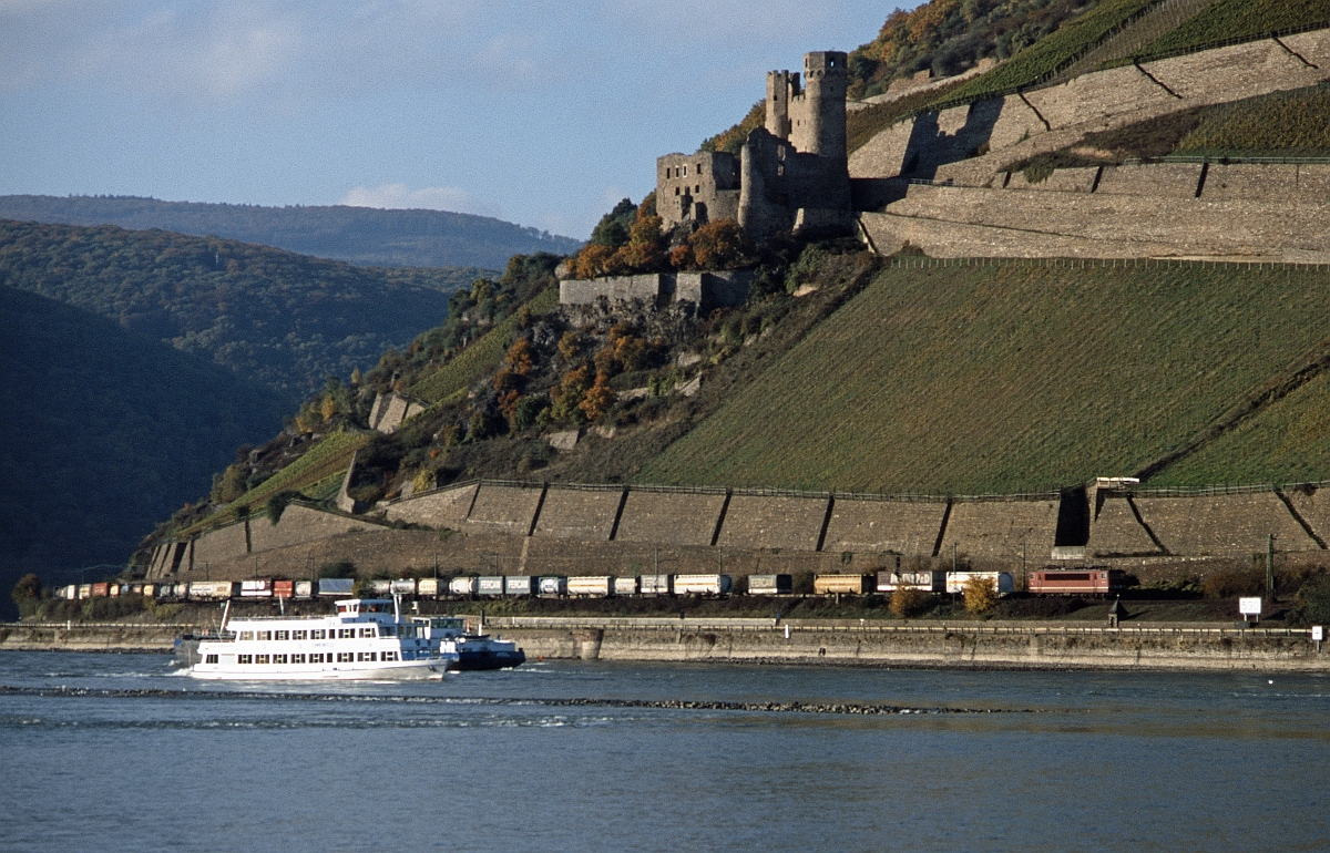 Nach der "Wende" wurden einige "DR-Energiecontainer" der Baureihe 155 beim BW Mannheim beheimatet und auch am Rhein heimisch. Im Juli 1991 ist eine 155 mit einem KLV-Zug von Köln-Eifeltor nach Busto Arsizio (Milano) zwischen Assmannshausen und Rüdesheim vor der Kulisse der Ruine Ehrenfels unterwegs.