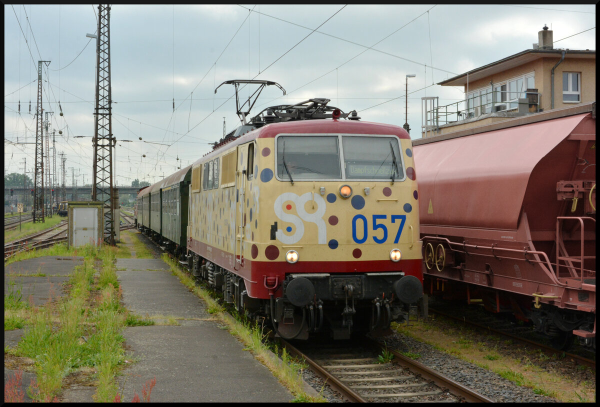 Die Elektrolok 111 057 (Smart Rail) beförderte am 18.05.2025 als  Dampfschnellzug  die Besucher des Lokschuppenfests in dreiachsigen Umbauwagen (Bauarten AB3yg & B3yg) zwischen Hanau Hbf und dem historischen Bahnbetriebswerk Hanau. Am Zugschluss hing die Diesellok 294 586-3 (KonRail).
