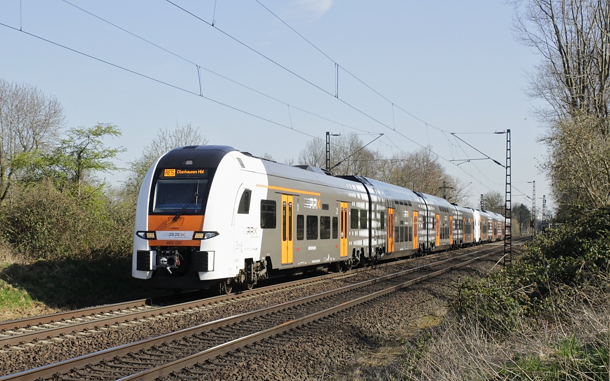 Wegen der Streckensperrung der rechtsrheinischen Strecke zwischen Düsseldorf und Köln verkehrt der RE 5 zur Zeit linksrheinisch über Neuss, hier durcheilt 462 021 Kaarst Broicherseite am 30.03.2021 in Richtung Duisburg