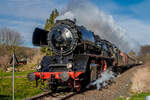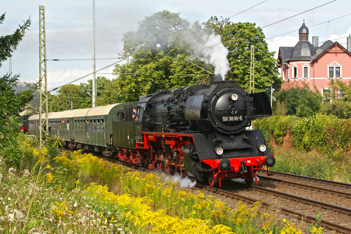 Am 26.8.23 fuhren 50 3616 und 50 3648 als Parallelfahrt von Flöha nach Freiberg (Sachs), hier zusehen ist 50 3616 mit ihrem Zug im Regelgleis kurz nach dem Haltepunkt Falkenau (Sachsen) Süd.