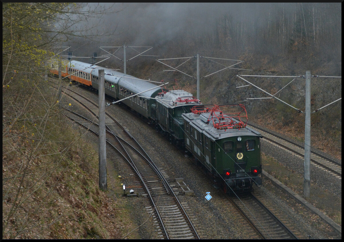 Ausgebremste Parallelfahrt: Die historischen Elektroloks E 7710 & E 94 088 (EZW) schoben den von Dampflok 58 1111-2 geführten Sonderzug DZ 26320 Dresden Hbf - Freiberg/Sachs über die letzten Meter der Tharandter Rampe nach. Der bis dahin nebenher gefahrene Güterzug wurde durch das "Halt" zeigende Einfahrsignal des Bf. Klingenberg-Colmnitz ausgebremst. Der entgegenkommende Planverkehr zwang den Fotogüterzug auf das Ausweichgleis rechts im Bild. Matthias Kümmel