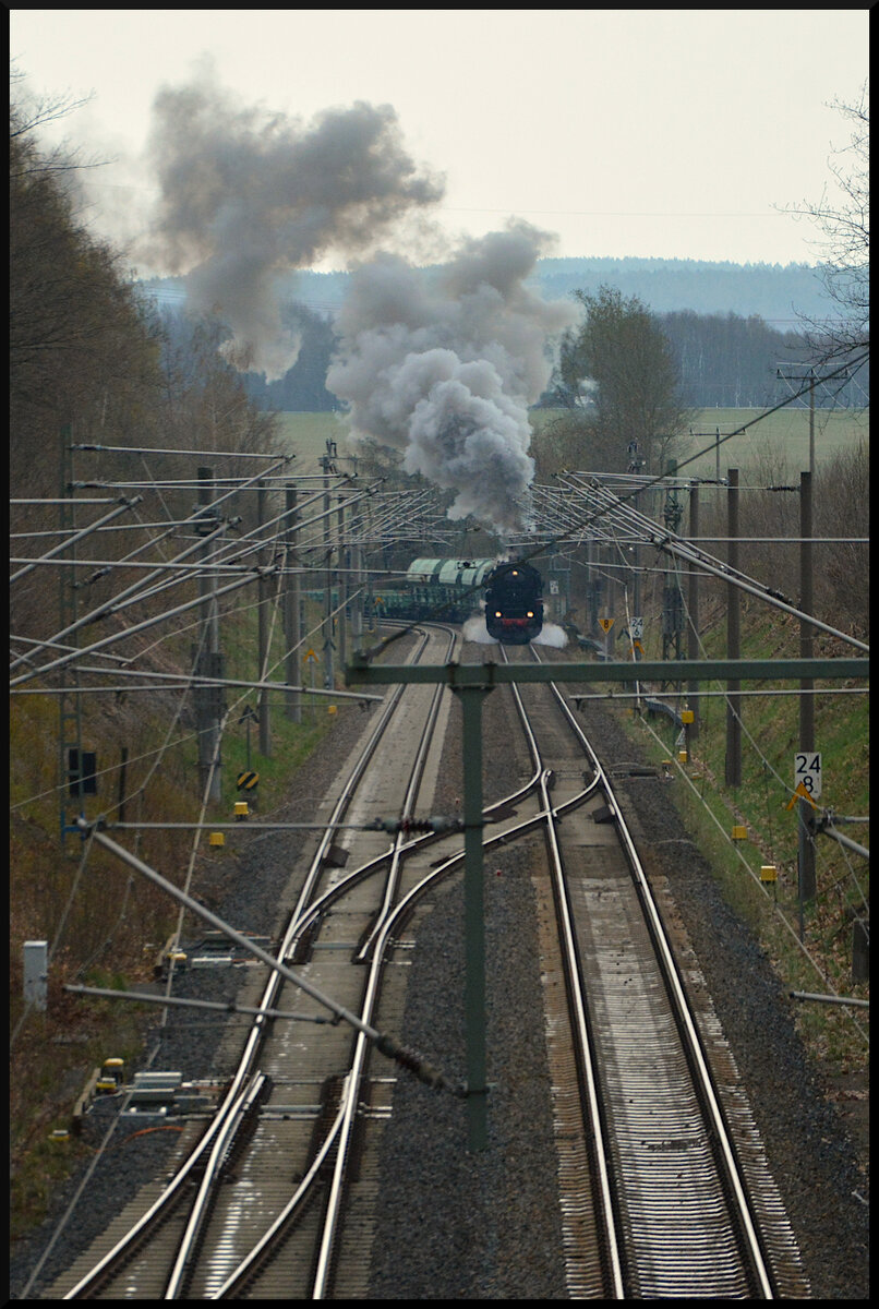 Ausgebremste Parallelfahrt: Zur Enttäuschung der vielen Fotografen auf der Brücke in Klingenberg führte UEF 58 1111-2 allein den Sonderzug DZ 26320 Dresden Hbf - Freiberg/Sachs über die letzten Meter der Tharandter Rampe. Der bis dahin nebenher gefahrene Güterzug wurde durch das "Halt" zeigende Einfahrsignal des Bf. Klingenberg-Colmnitz ausgebremst. Der entgegenkommende Planverkehr zwang den Fotogüterzug auf des Ausweichgleis. Matthias Kümmel