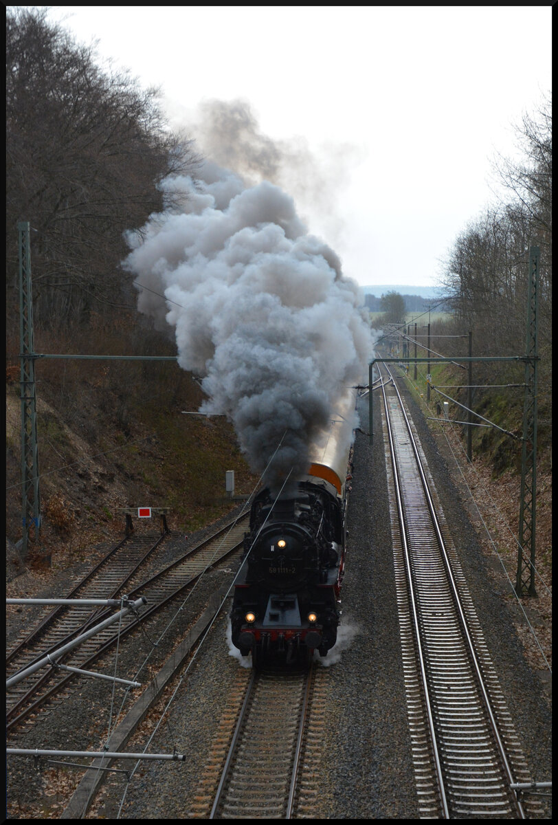 Ausgebremste Parallelfahrt: Zur Enttäuschung der vielen Fotografen auf der Brücke in Klingenberg bog UEF 58 1111-5 allein mit dem Sonderzug DZ 26320 Dresden Hbf - Freiberg/Sachs um die letzte Kurve der Tharandter Rampe. Der bis dahin nebenher gefahrene Güterzug wurde durch das "Halt" zeigende Einfahrsignal des Bf. Klingenberg-Colmnitz ausgebremst. Der entgegenkommende Planverkehr zwang den Fotogüterzug auf des Ausweichgleis. Matthias Kümmel