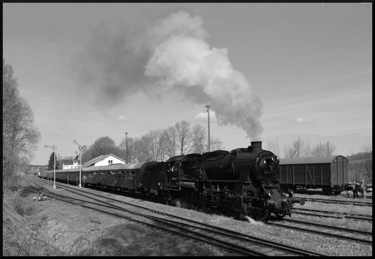 UEF 58 1111 (NVR: 90 80 0058 311-6 D-UEF) am 18.04.2026 mit dem GleisGlück-Sonderzug DZ 88724 Chemnitz - Schlettau - Chemnitz. Die 1921 gebaute Dampflok (MBG - Maschinenbau-Gesellschaft Karlsruhe, Fabriknummer: 2153) war auf ihrer ersten Erzgebirgsrunde unterwegs und arbeitete sich hier über die bekannte Schwimmbad-Brücke die Steigung nach Scheibenberg hinauf. Am Schluss schob die grün-weiße V100 003 (NVR: 92 80 1201 003-1 D-DB, DB Museum Nürnberg) den aus acht Wagen bestehenden Zug nach. Matthias Kümmel