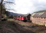 293 002 fuhr nach dem Richtungswechsel in Wurzbach am 08.01.22 mit einem leeren Holzzug von Blankenstein nach Saalfeld. Hier ist der Zug in Leutenberg zu sehen.