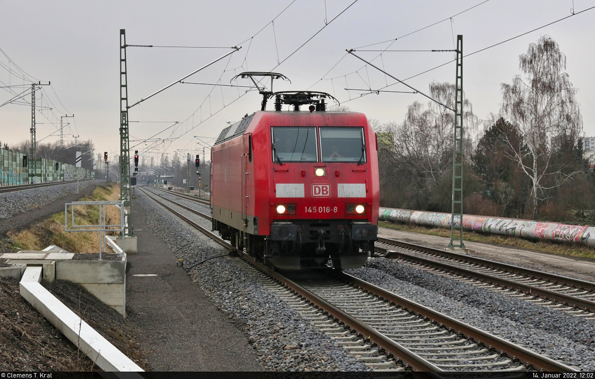 145 018-8 durchfährt als Tfzf den Hp Halle Rosengarten auf Gleis 1 Richtung ZBA Halle (Saale), um dort Güterwagen mitzunehmen.