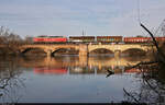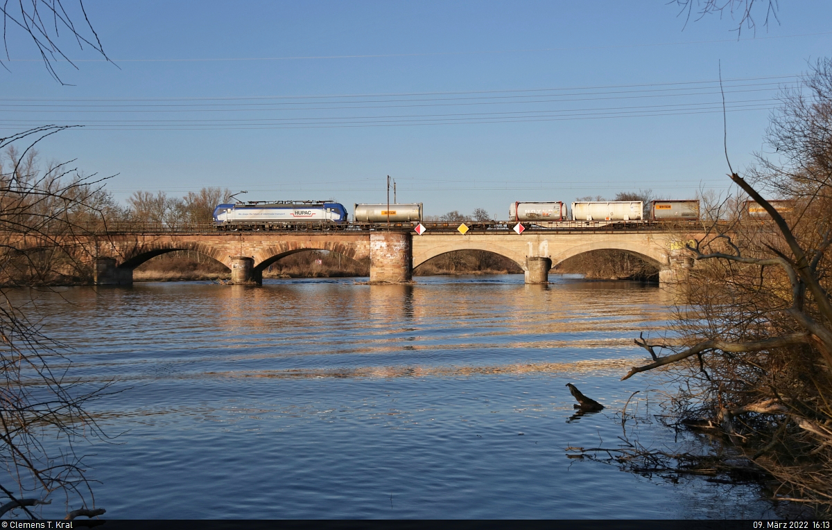Zuvor noch nicht am Bertschi-Zug gesehen: die Siemens-eigene Hupac 193 490-0. Auf dem Weg zum Kraftwerk Schkopau (Buna-Werke) zieht der Vectron die Container in Halle-Wörmlitz über die Saale, deren Wasseroberfläche gerade durch ein Motorboot aufgewirbelt wurde.