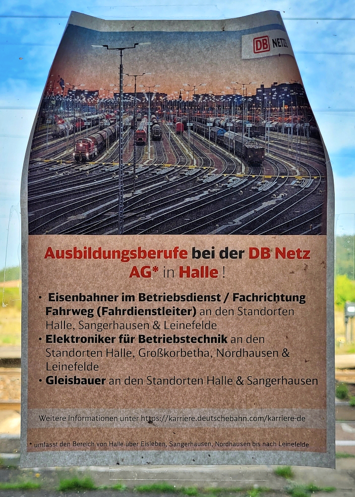 Die Deutsche Bahn versucht hiermit, neues Personal an sich zu binden. Hätte man vor etwa 20 Jahren eine andere Politik gefahren – wer weiß, vielleicht wäre ein solcher Aushang heute nicht so überlebenswichtig.