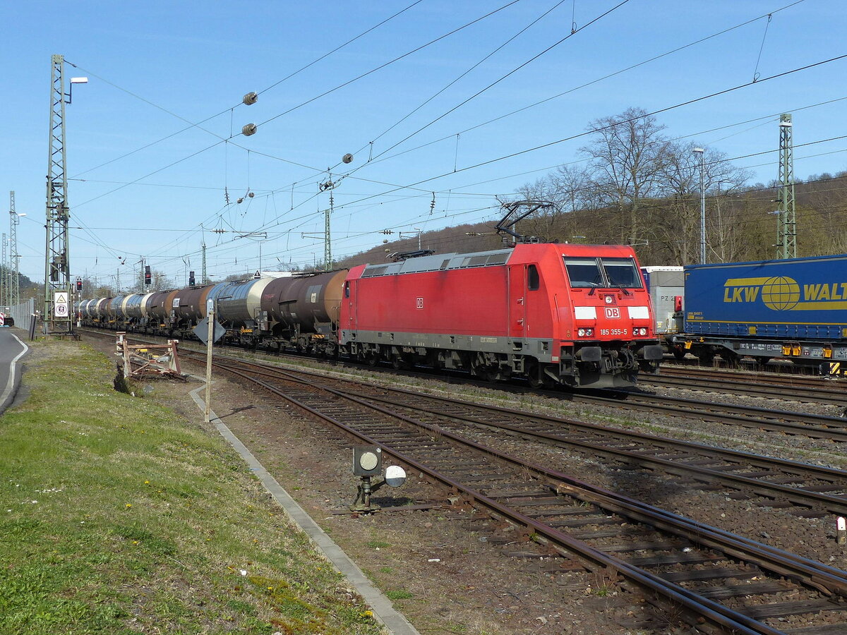 DB 185 355-5 mit Kesselwagen Richtung Fulda, am 11.04.2022 in Bad Hersfeld.