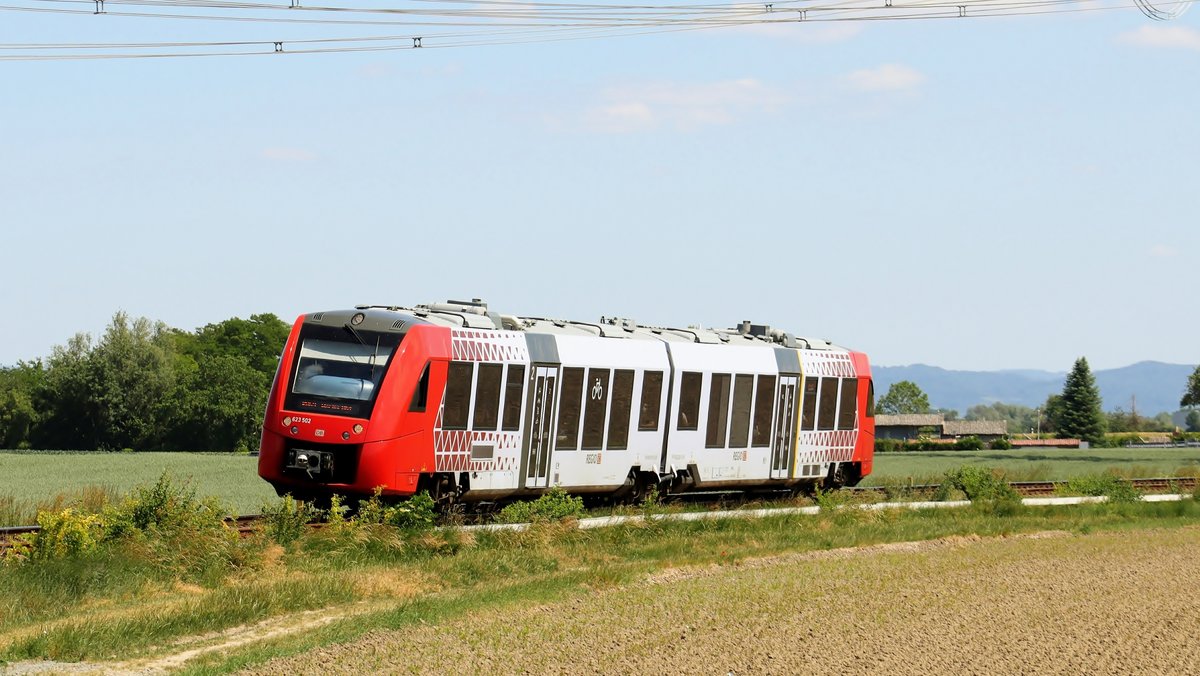 Aus Richtung Worms kommt der 623 002 als RB 62 auf der Nibelungenbahn gen Bensheim fahrend in Lorsch an. Am Sonntagabend den 13.8.2017