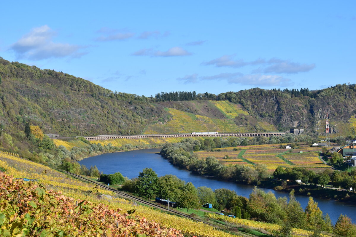 Vom oberen Ortsrand von Reil hat man eine tolle Aussicht auf den Pündericher Hangviadukt. Ein 1429er überquert den Pündericher in Richtung Trier.