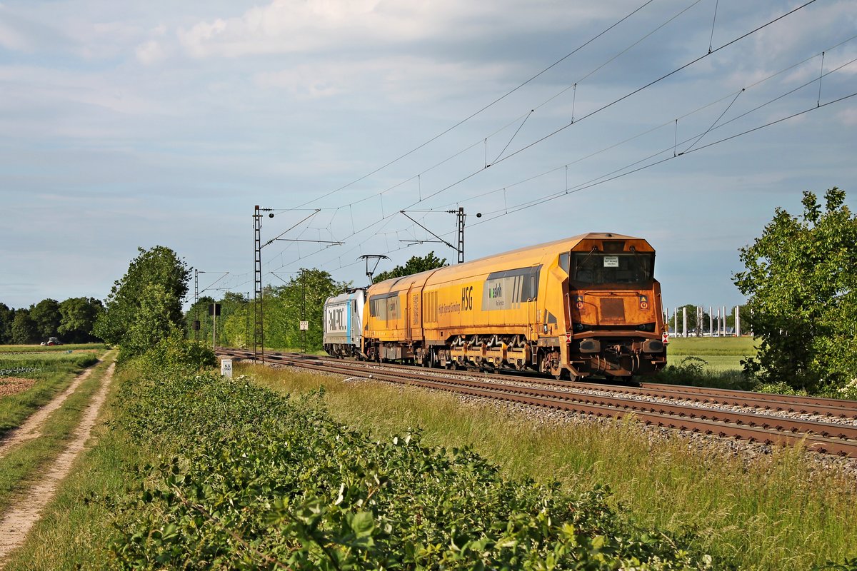 Nachschuss auf den Schleifzug (Vossloh HSG-2 / 99 80 9527 00x-x), welcher am Abend des 19.05.2020 von der Rpool/MWB 187 310-8 südlich von Buggingen über die Rheintalbahn durchs Markgräflerland in Richtung Freiburg (Breisgau) geschleppt wurde.
