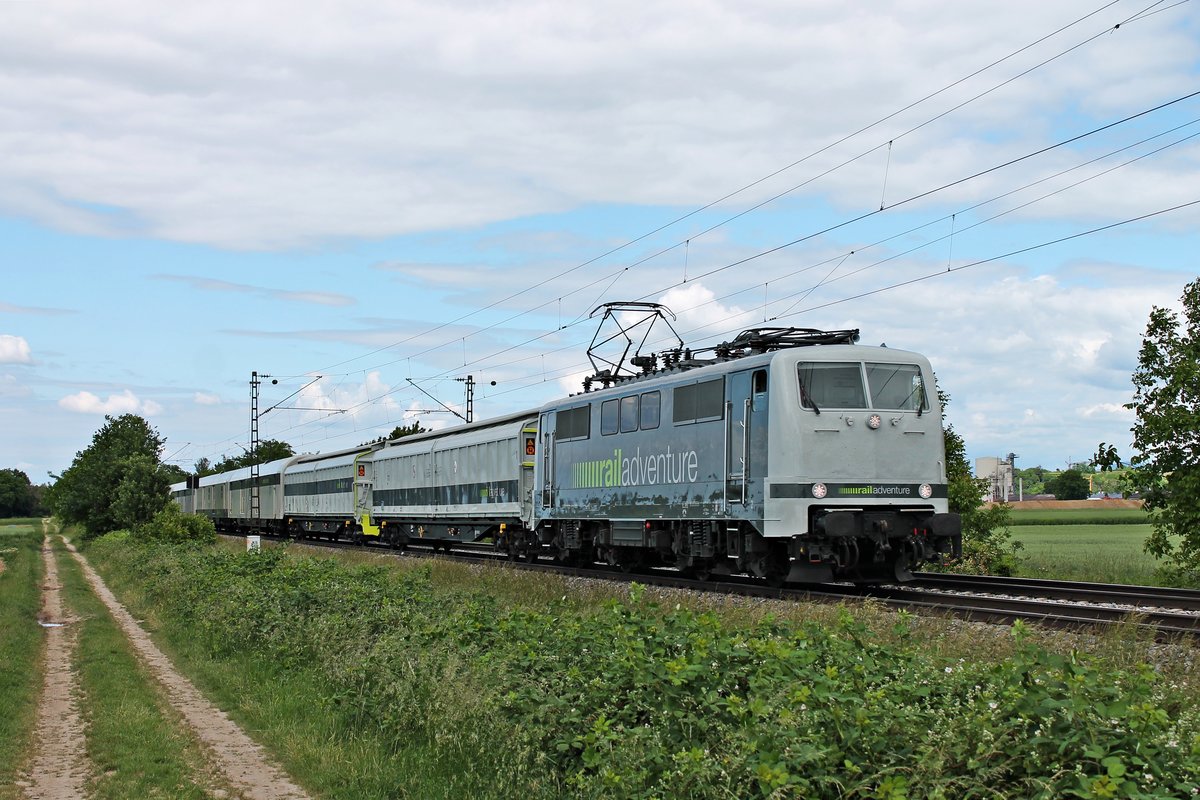 Am 25.05.2020 fuhr RADVE 111 222-6 mit vielen Kuppelwagen und 111 210-1, 4185 011-1 und 183 500-8 südlich von Buggingen über die Rheintalbahn durchs Markgräflerland in Richtung Basel.