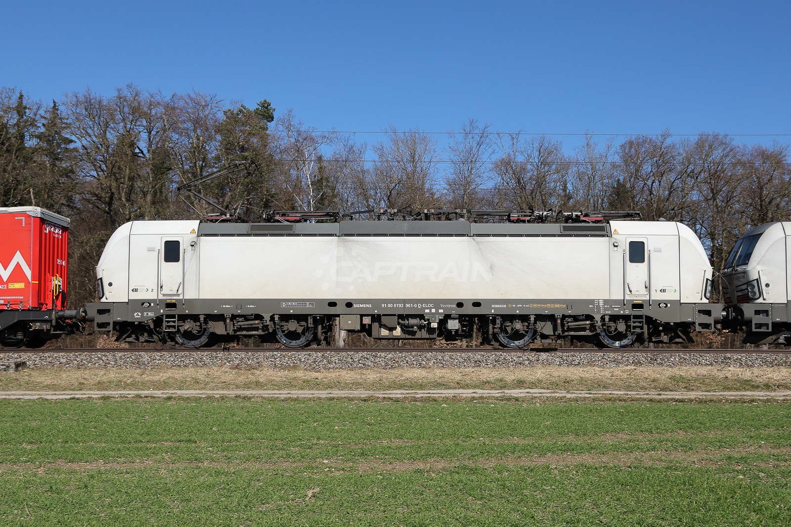 ELL Vectron "193 961" [NVR-Nummer: 91 80 6193 961-0 D-ELOC] am 5.3.26 bei Eglharting. Man kann noch leicht die Captrain Titel erkennen.