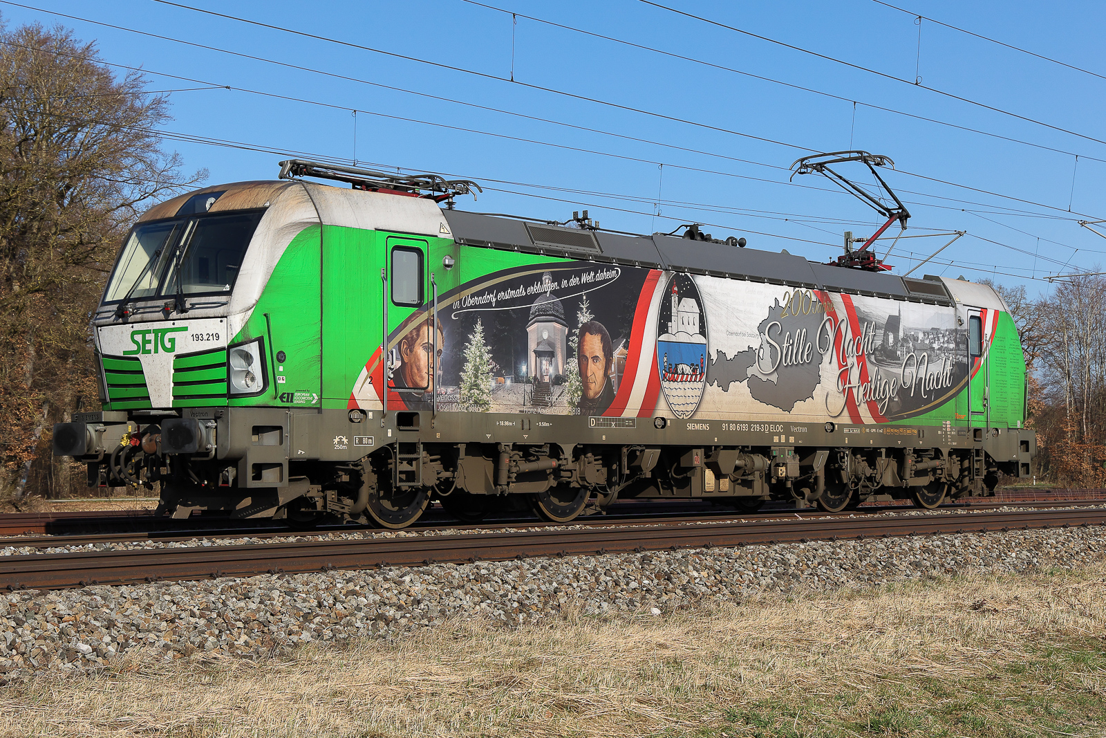 SETG 193 219  200 Jahre Stille Nacht Heilige Nacht . Hatte ich noch nicht, und dann hält sie direkt vor mir am Signal mal kurz an. Das war gut am 5.3.26 bei Eglharting.