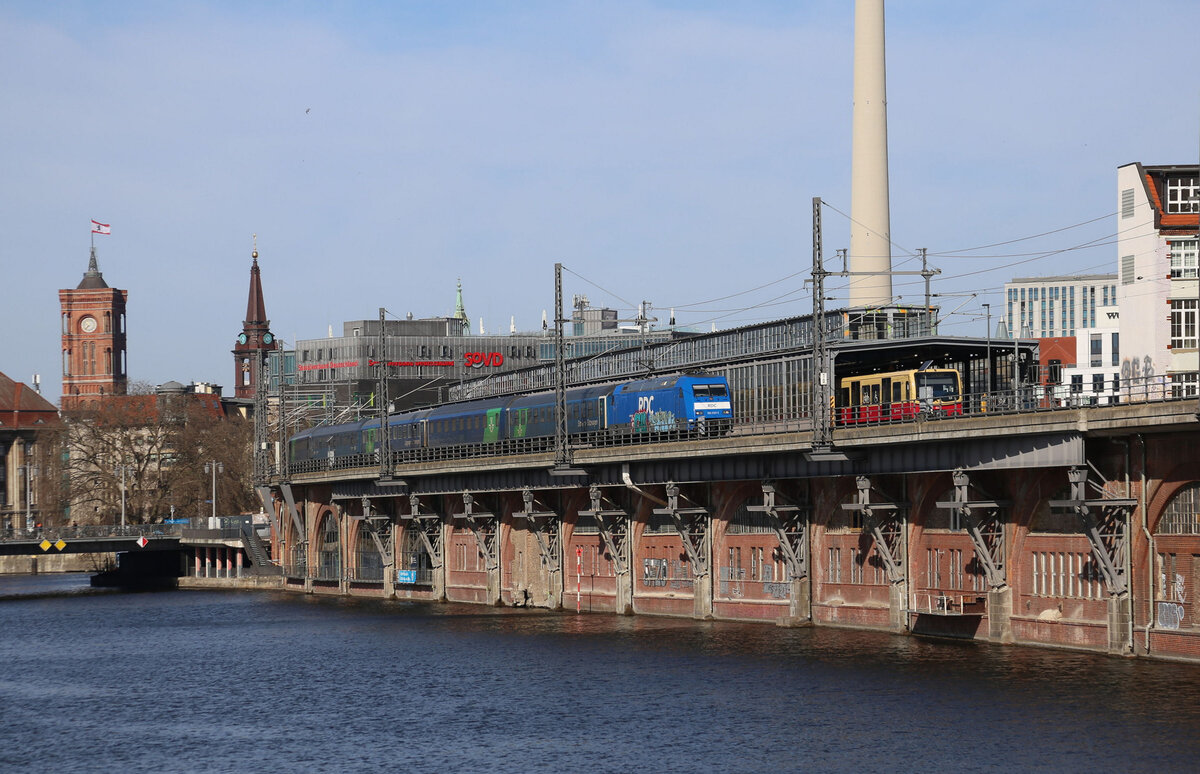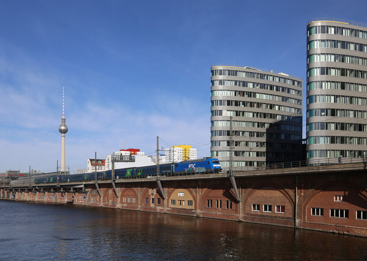 RDC 101027-1 hat hier gerade am 13.03.2026 um 10.40 Uhr mit einer Nachtzug Garnitur den S Bahnhof Jannowitzbrücke passiert und erreicht in Kürze den Berliner Ostbahnhof. Gerd Hahn