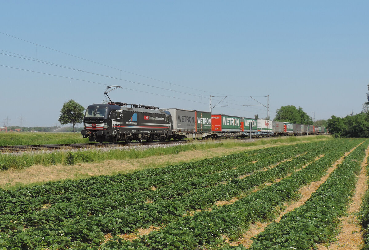 Kenzingen - 9. Juni 2023 : Shadowpiercer 193 659 "Berlin", Die Güterbahnen Werbelok, mit einem KLV nach Basel.