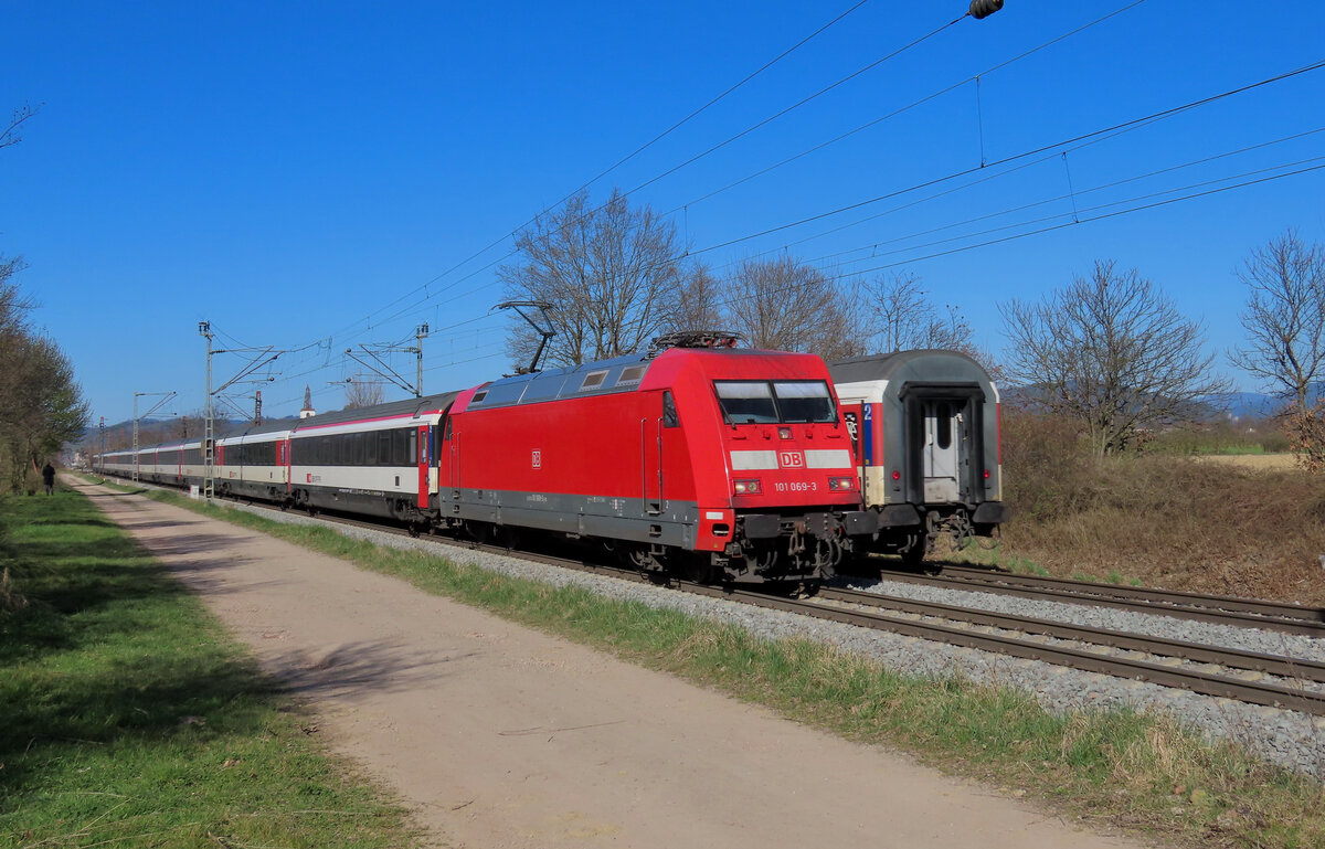 Denzlingen - 19. März 2025 : 101 069 am EC 9 von Dortmund nach Zürich. Auf dem Bild sieht mann der letzte Wagen des EC 6 Interlaken Ost - Hamburg Altona, gezogen von der 101 009.