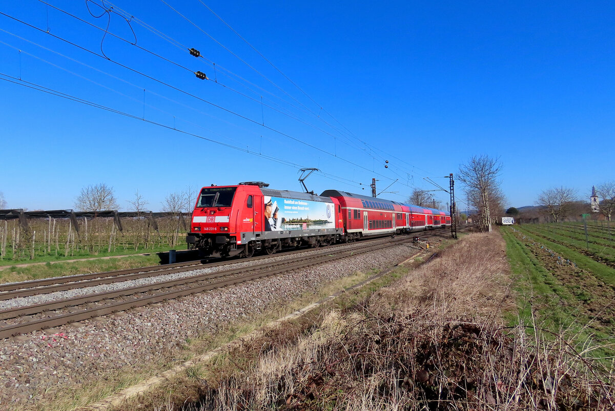 Denzlingen - 19. März 2025 :  Radolfzell am Bodensee  Werbelok 146 231 am RE 4749 von Offenburg nach Freiburg.