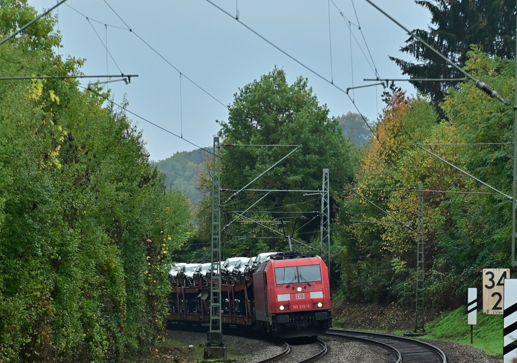 Am Mittag des 24.10.2022 ist die 185 339-9 damit beschäfftigt einen Autotransportzug vom Audiwerk in Neckarsulm gen Heidelberg und weiter nach Seelze zutransportieren, hier ist der Zug in Neckargerach zusehen.