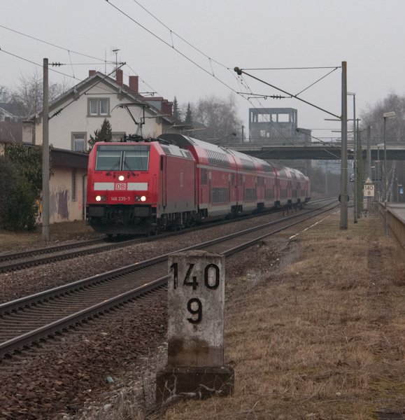 146 235-7 + 146 116-9 mit dem  Sixpack  IRE 5191 (Karlsruhe Hbf - Kreuzlingen) am 24. Januar 2010 bei der Durchfahrt Mühlhausen.