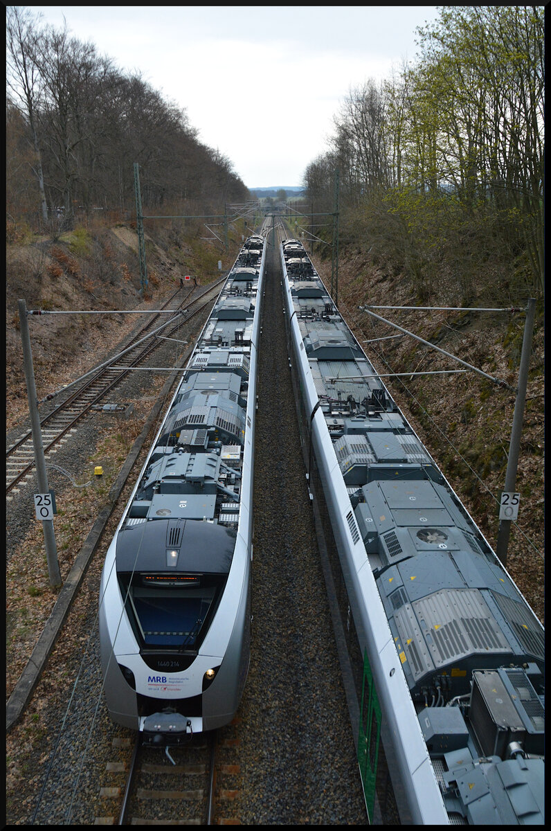 Ausgebremster Planverkehr: Anlässlich des 18. Dresdner Dampfloktreffens verkehrte am 12.04.2026 die traditionelle Parallelfahrt historischer Dampfzüge über die Tharandter Rampe. An diesem Tag gab es Verzögerungen, s. d. die Planverkehre ausgebremst wurden. Die MRB 1440 214 und eine weitere Grinsekatze mussten sich deshalb auf ihren Wegen von und nach Dresden etwas gedulden, bevor sie den bekannten Streckenabschnitt passieren konnten. Matthias Kümmel