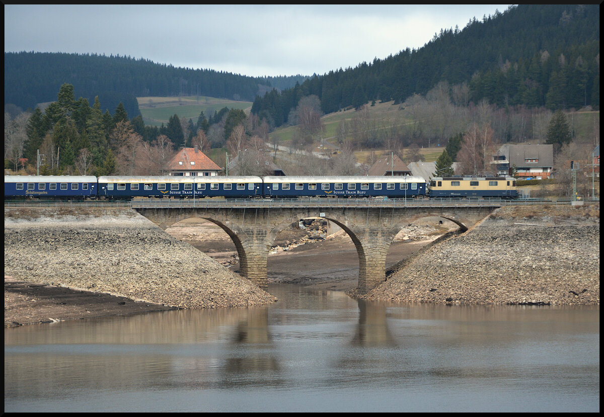 Die schweizerische Elektrolokomotive IRSI 421 387 mit dem Sonderzug DZ 13400 Zürich - Seebrugg am 28.02.2026 auf der Schluchseebrücke in Schluchsee (Schwarzwald). Die Waggons stellten Prestige Continental Express und Suisse Train Bleu, Veranstalter der Fahrt war Eurovapor. Matthias Kümmel