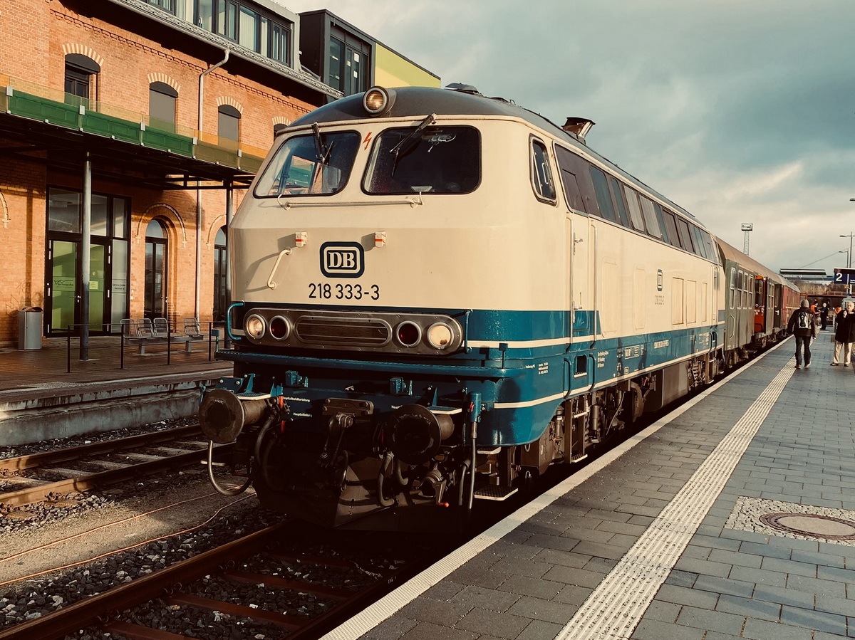 D-PRESS 218 454-7 (218 056-1) rangierte am 01.12.2025 in die Abstellung des Lübecker Hbf (AL). (Kleiner Fakt am Rande, bei dieser 218 wurden die Lüftungsgitter im Bereich des Motors und des Heizungsgenerators vertauscht)