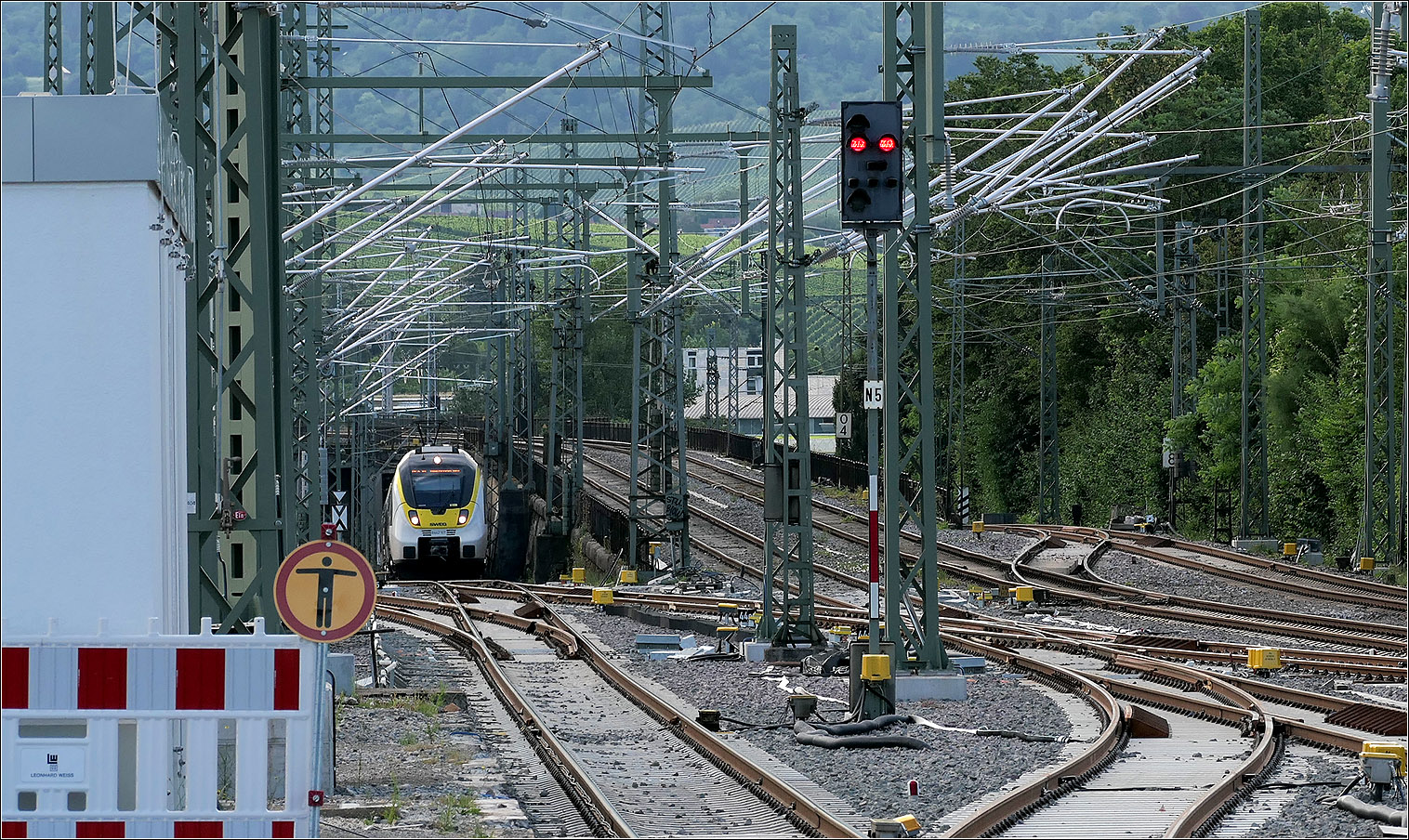 ... in Stuttgart-Bad Cannstatt in den MEX 18 nach Osterburken. im Vorfeld des Bahnhofes Bad Cannstatt vereinigen sich kreuzungsfrei die Filstal- und die Remsbahn. Der Talent 2 kommt auf der Filsbahn aus Tübingen her. Die beiden Gleise der Remsbahn kommen von oben her, das Gegengleis der Filsbahn senkt sich ganz rechts nach unten ab.