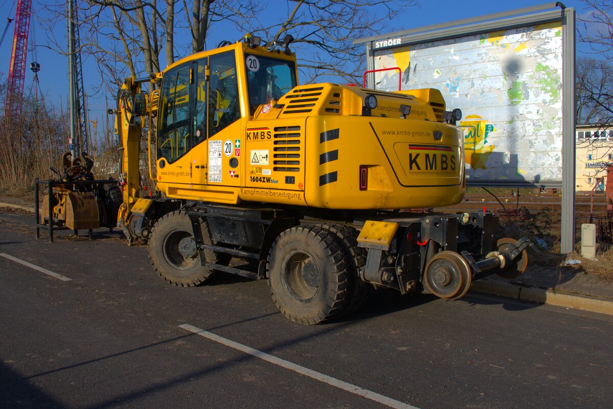 Bauarbeiten zur Elektrifizierung der Südbahn, Streckenabschnitt Biberach - Aulendorf. Während rund 3 km südlicher die Oberleitungsmasten bereits stehen und die Oberleitung montiert wird, stehen zwischen Bahnhof Biberach (Riß) und Haltestelle Biberach Süd nur vereinzelt die Masten oder wie hier im Bild liegen die Einzelteile bereit, aber das Fundament wurde noch nicht ausgehoben. Am 23.04.2019 passiert ein Zweiwegebagger auf der Fahrt Richtung Biberach Süd den Standort eines zukünftigen Oberleitungsmasten.