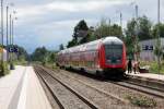 Im Rahmen der Elektrifizierung der Südbahn mussten die Gleise unter zwei Brücken in und bei Meckenbeuren abgesenkt werden, damit die Oberleitung durchgeführt werden kann. In Meckenbeuren transportiert ein Traktor mit Hänger den Erdaushub zur wenige hundert Meter entfernten Sammelstelle, wo der Erdaushub auf Lkw verladen und abtransportiert wird. Aufnahme vom 22.09.2020.