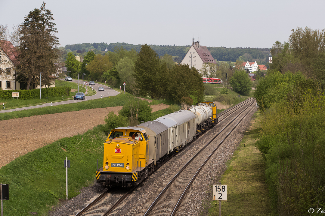 Am 11.05.2016 fuhren 203 309-0 und 203 307-4 mit dem Unkruatspritzzug von Aulendorf in Richtung Friedrichshafen. Hier bei Aulendorf-Zollenreute / Rugetsweiler.