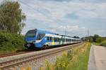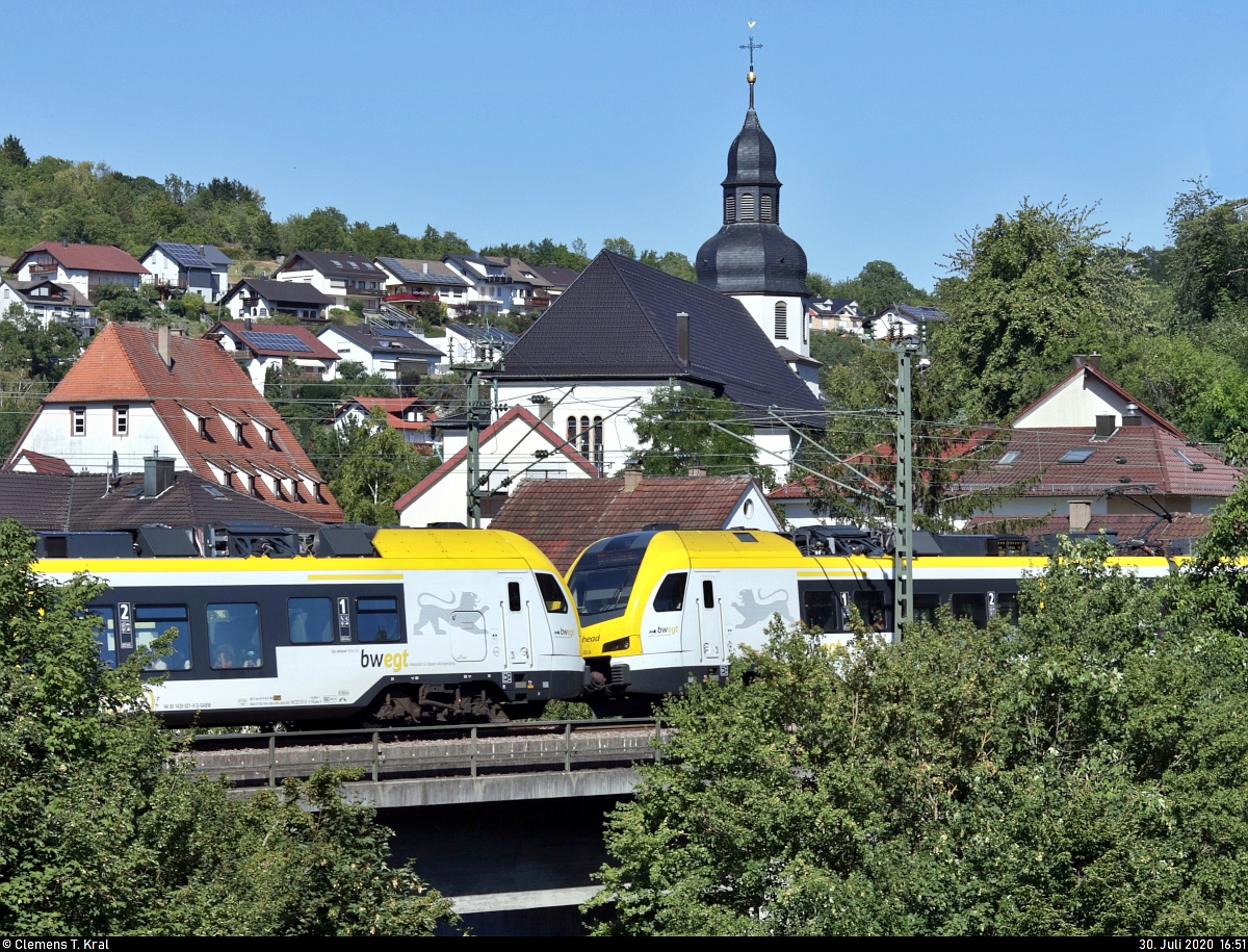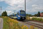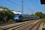 Zwei Stadler FLIRT 160 der Go-Ahead Baden-Württemberg GmbH (GABW) als RE 19023 (RE1) von Karlsruhe Hbf nach Stuttgart Hbf fahren in Ersingen (Kämpfelbach) auf der Bahnstrecke Karlsruhe–Mühlacker (Residenzbahn | KBS 770).