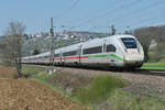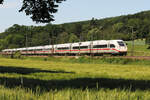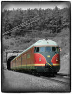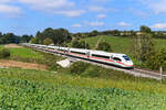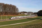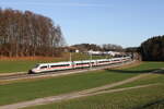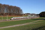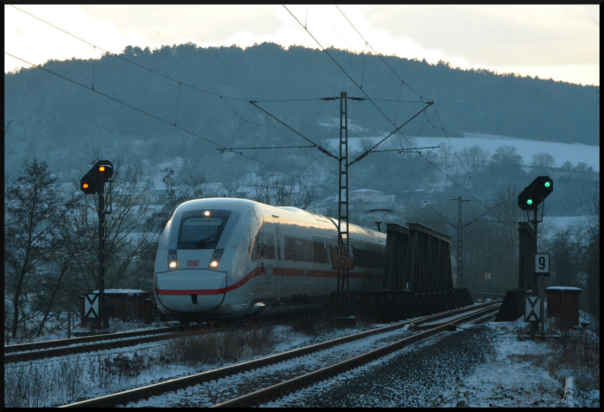 Mit 90 Sachen über die Tauber: Der ICE 118 "Bodensee" fuhr im Januar für drei Wochen von Innsbruck statt nach Dortmund nach Berlin. Dabei nahm er den Weg von Stuttgart über die Frankenbahn nach Würzburg und weiter über Halle/Saale in die Bundeshauptstadt. Am bitterkalten 20.01.2024 überquert der Zug kurz nach Sonnenuntergang das Flüsschen Tauber bei Lauda.