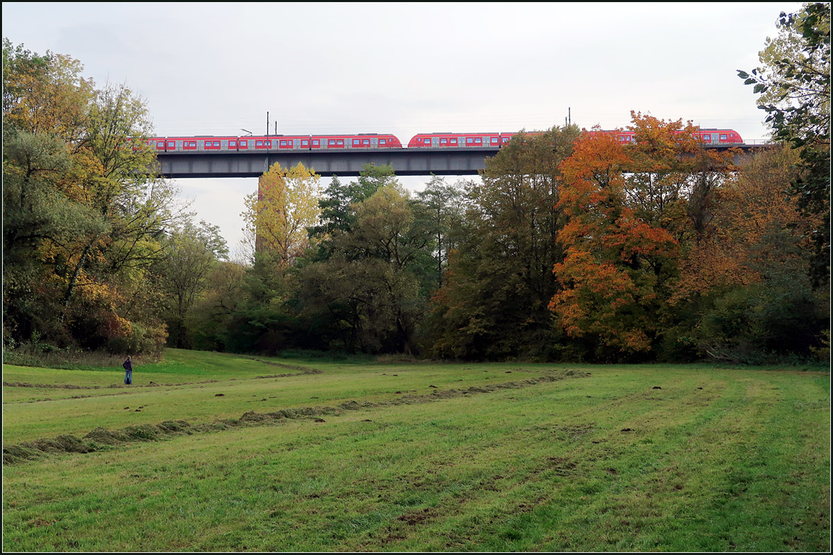 Zwischen Waiblingen und der Station Neustadt-Hohenacker überquert die Murrbahn auf einem Viadukt das hier eingeschnittene Remstal. Hier mit einem Zug der Baureihe 430 auf der S3 in Richtung Backnang.