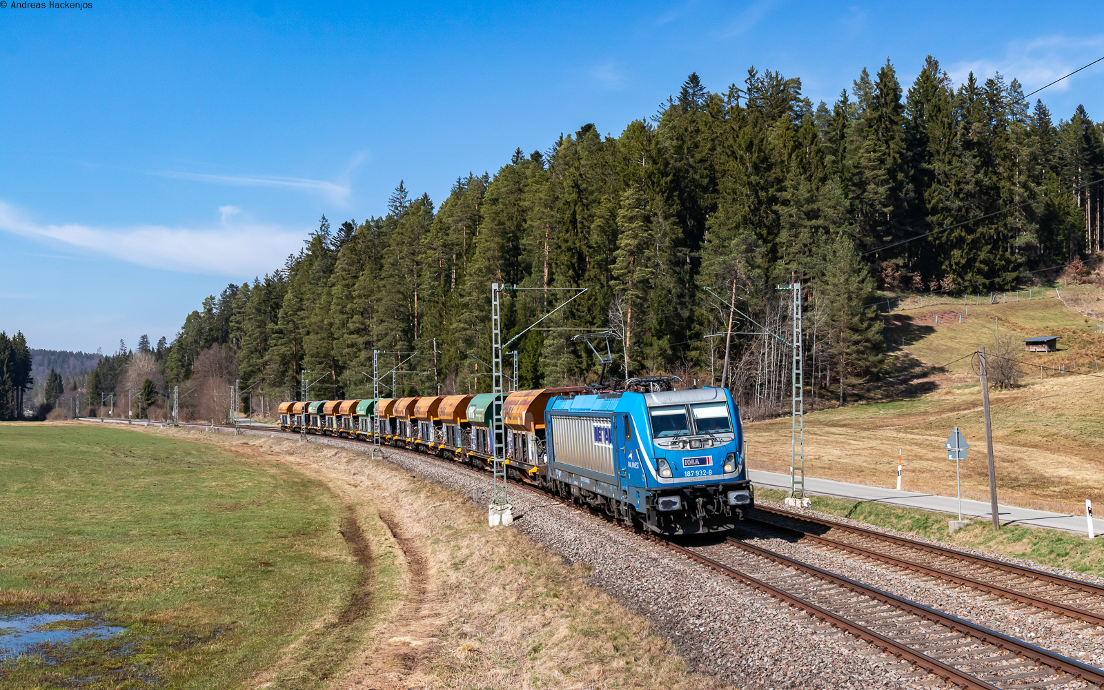187 318 Raildox "Hier fährt deine Chance" mit einem leeren Holzzug bei Laaber Richtung Nürnberg, 12.02.2022
